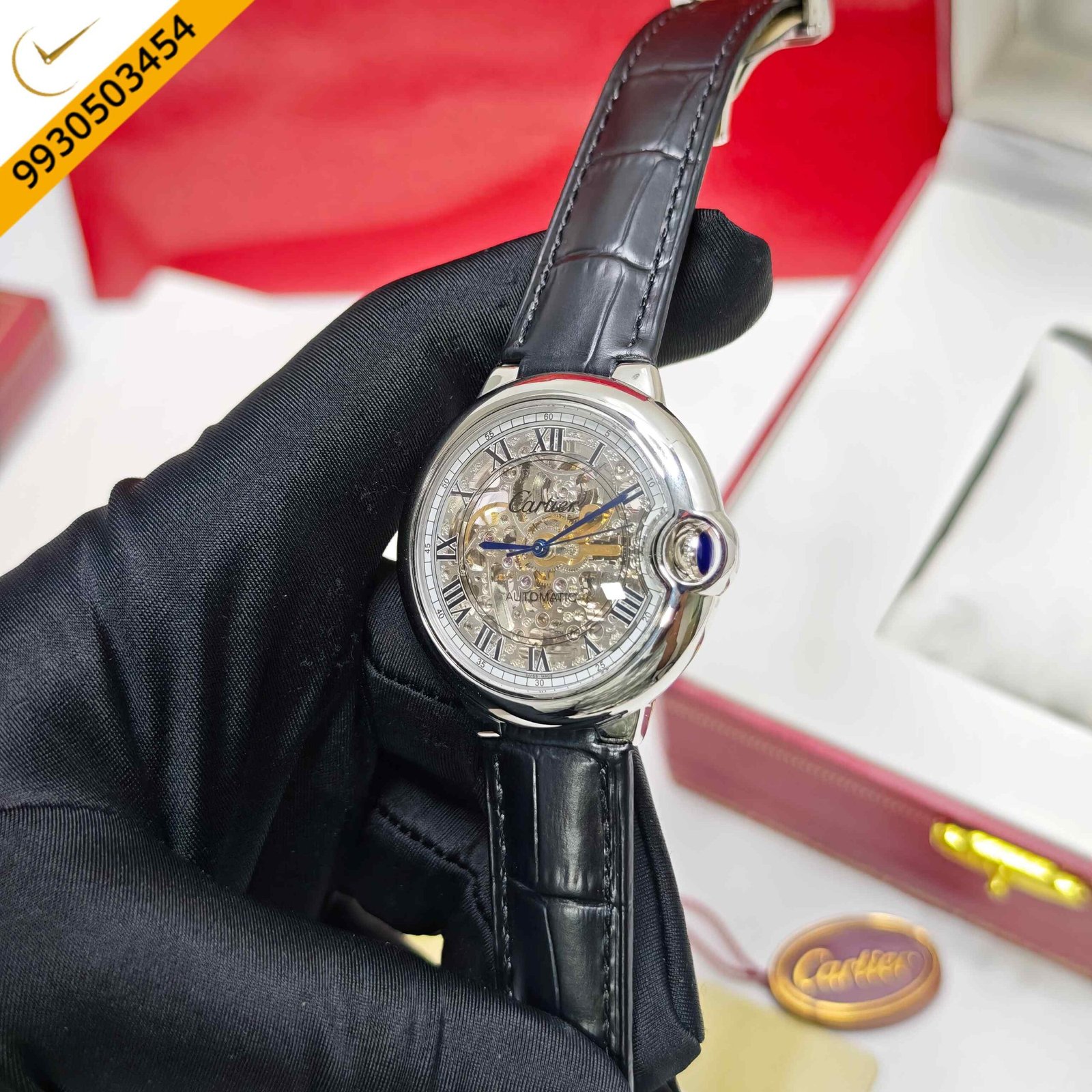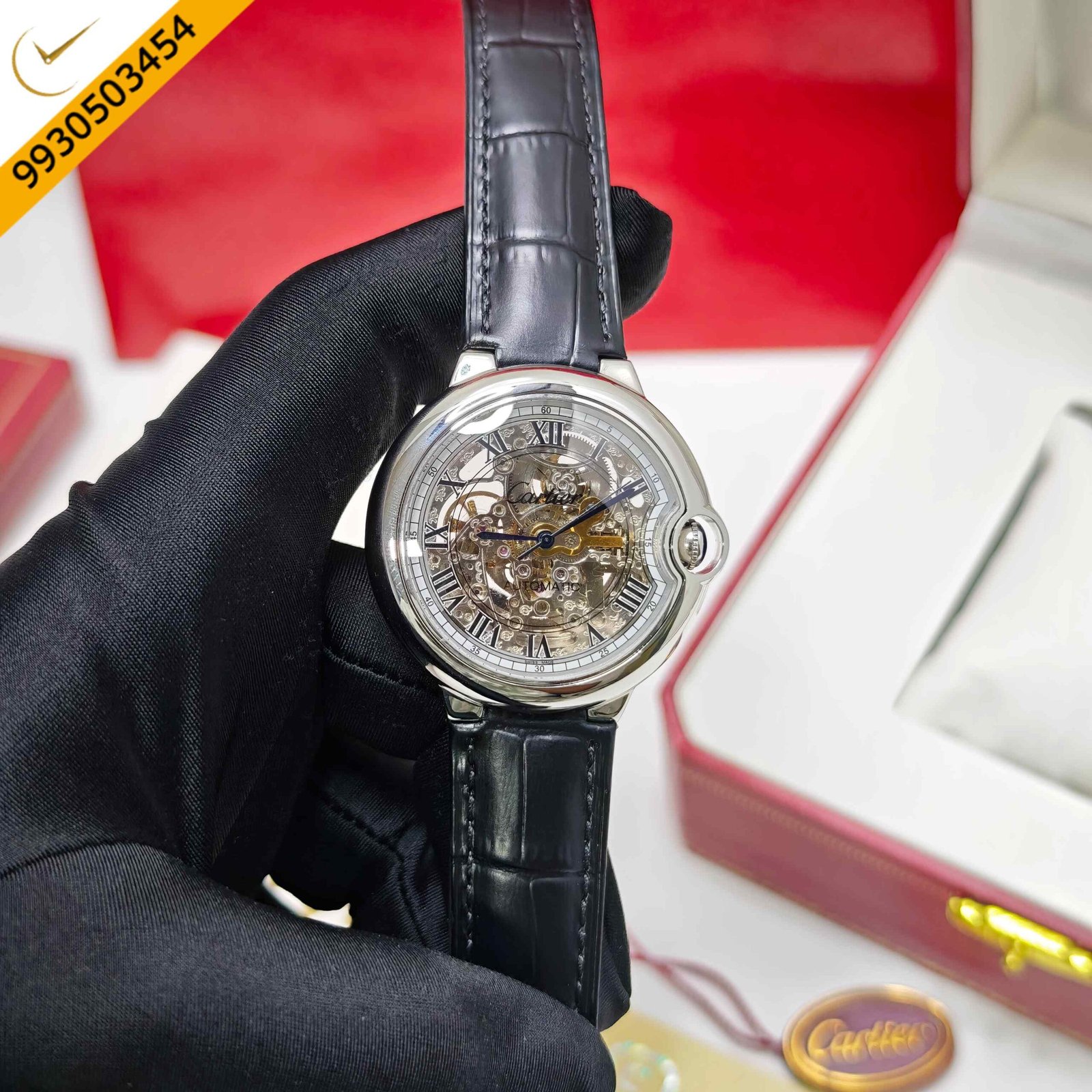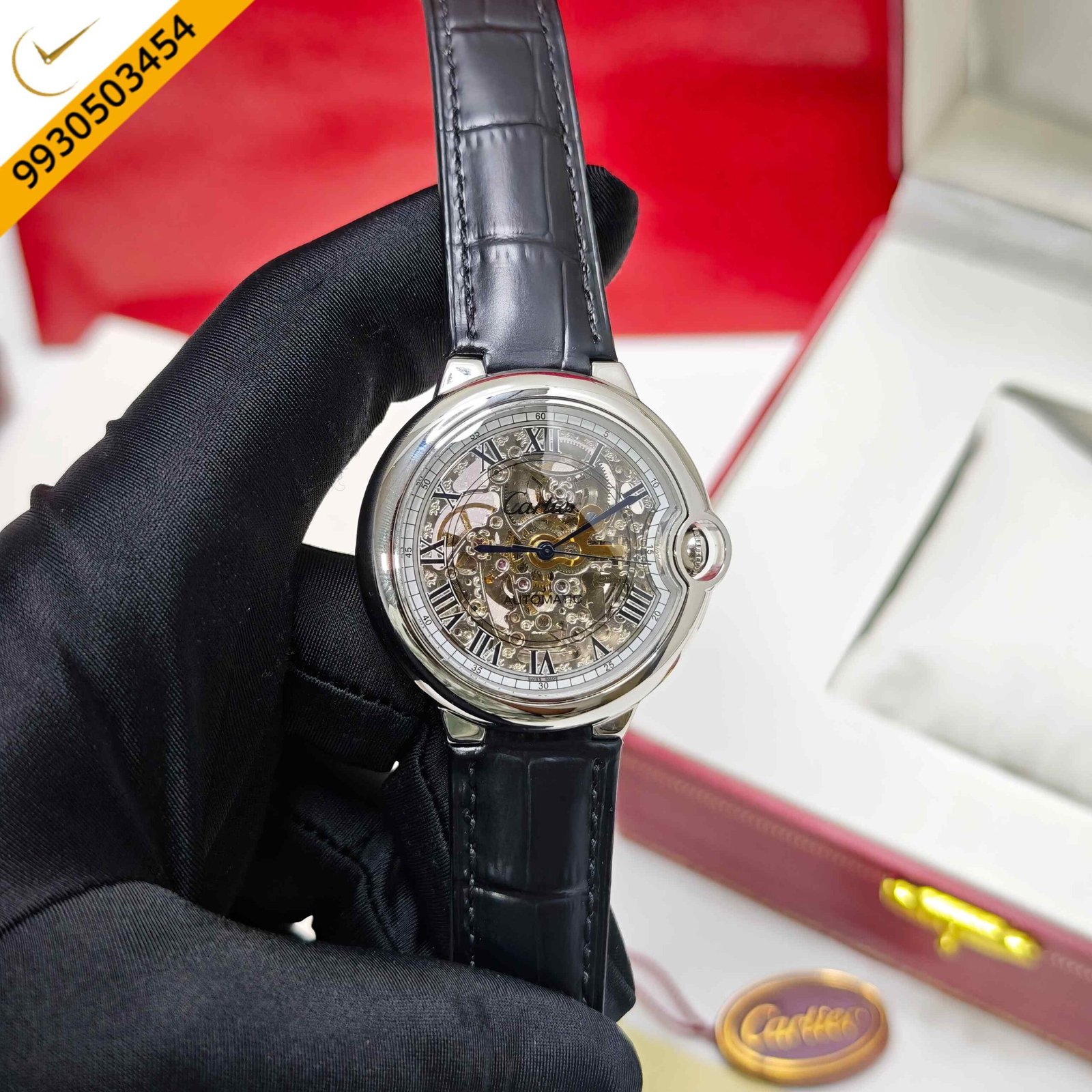 Cartier Ballon Bleu Steel Skeleton Dial Roman marker Black Leather Strap Swiss Automatic Watch