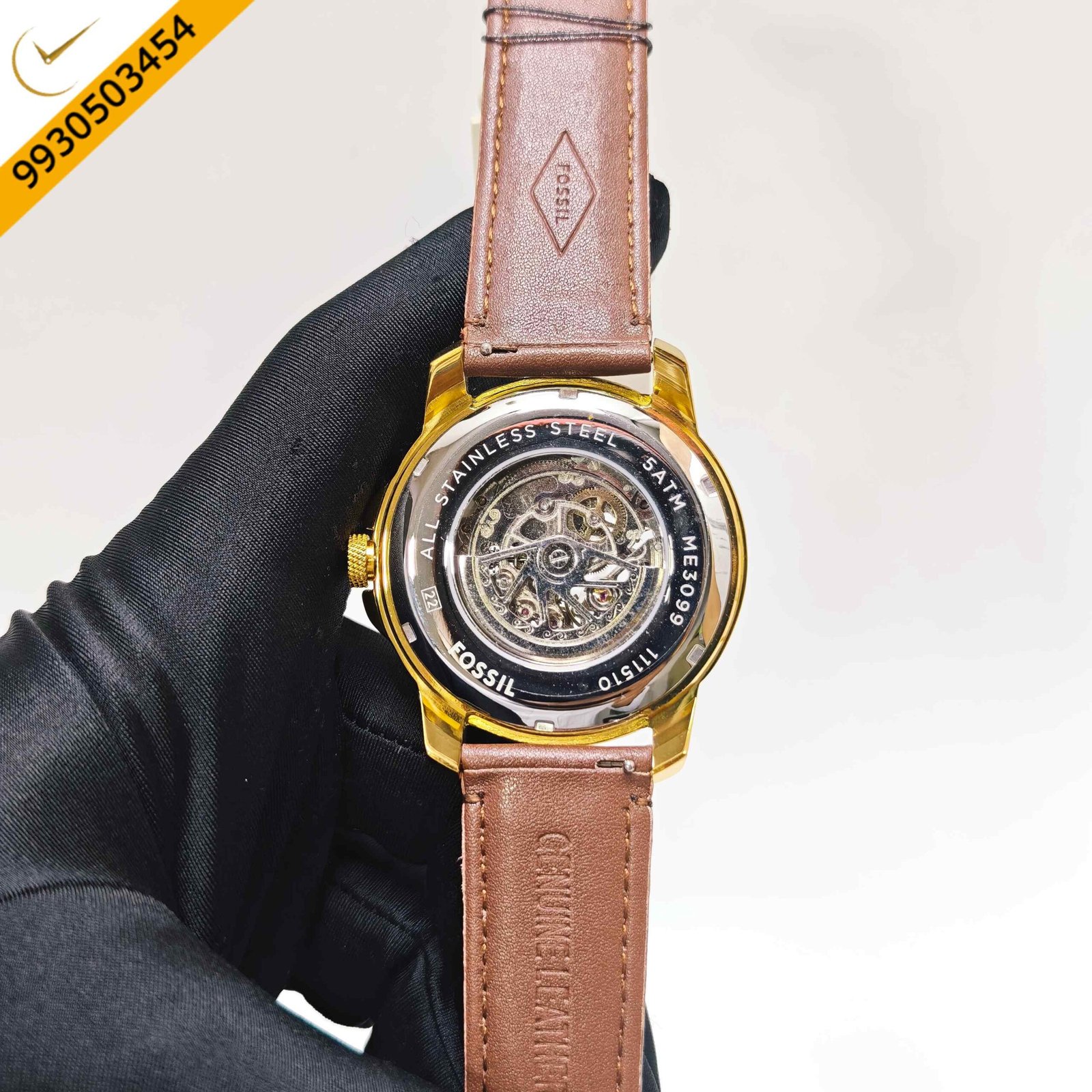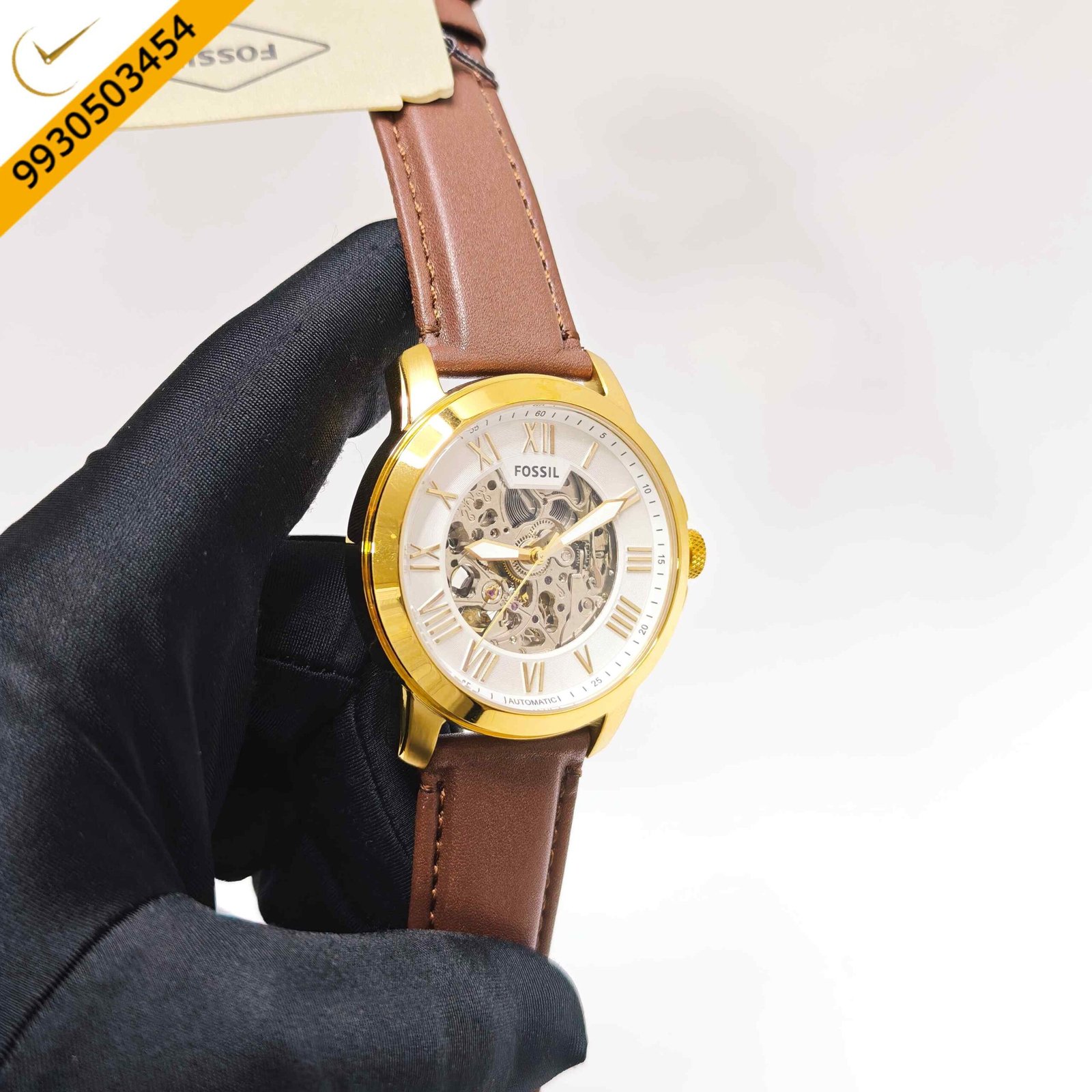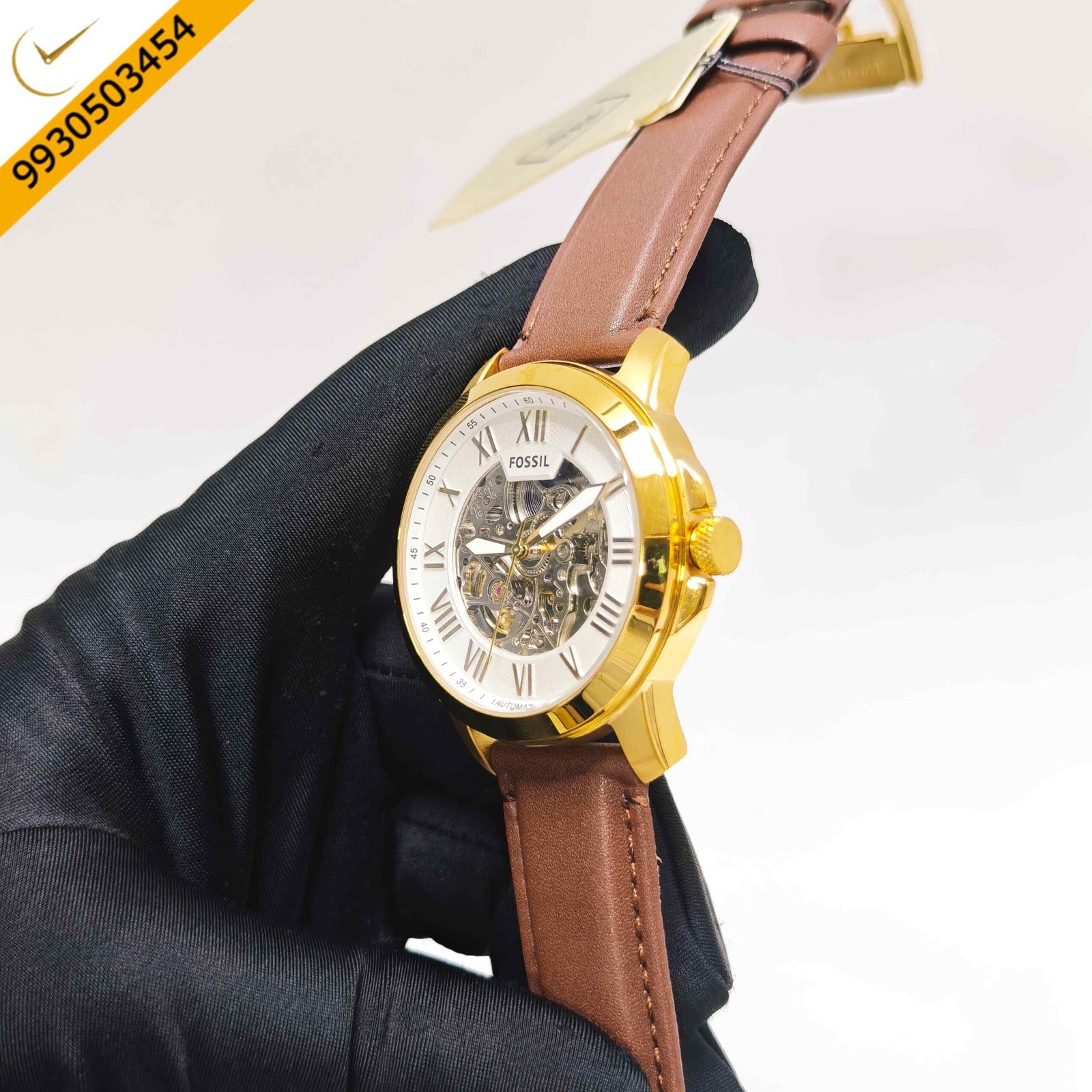 Fossil Grant Skeleton Roman Marker Full Gold White Dial Brown Leather Strap Swiss Automatic Watch