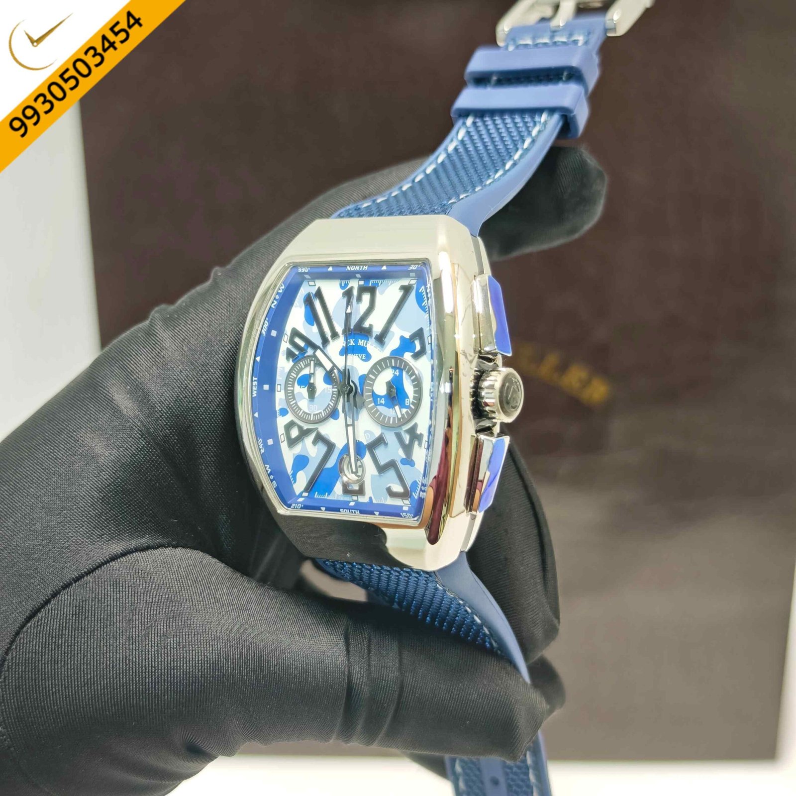 Franck Muller VANGAURD Chronograph CC DT Camo TT MC BL Steel Blue Dial Blue Rubber Strap Swiss Watch