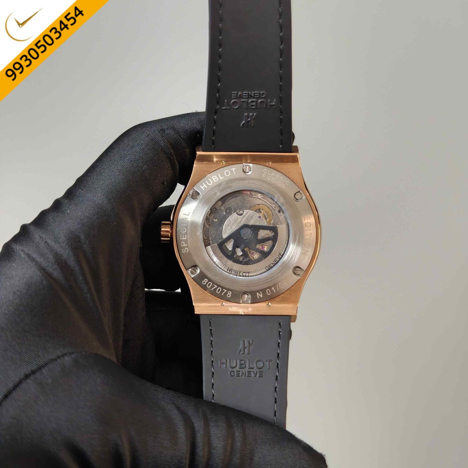Hublot Classic Fusion Rose Gold Diamond Bazel Black Dial Black Leather Strap Swiss Automatic Watch