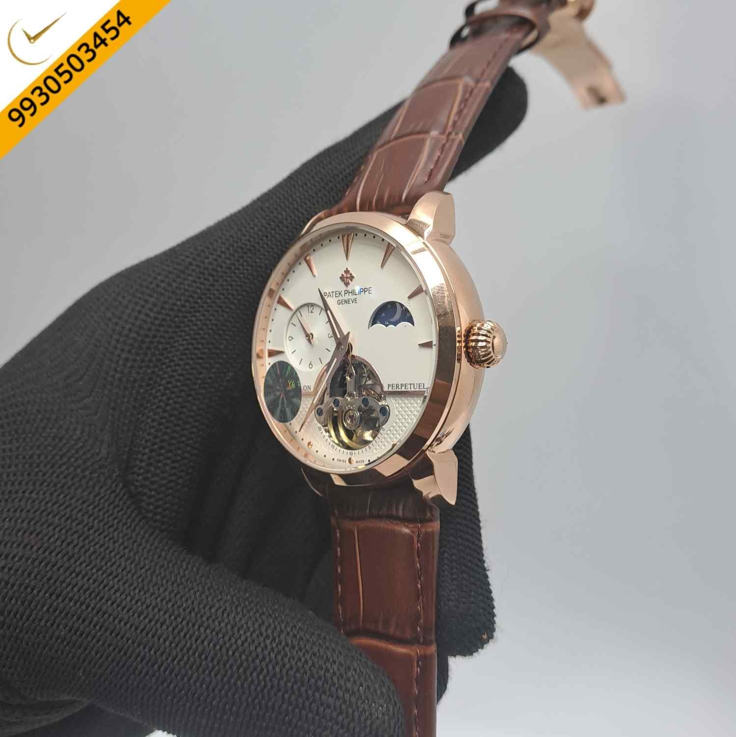 Patek Philippe Tourbillon Perpetuel Rose Gold White Dial Brown Leather Swiss Automatic Watch
